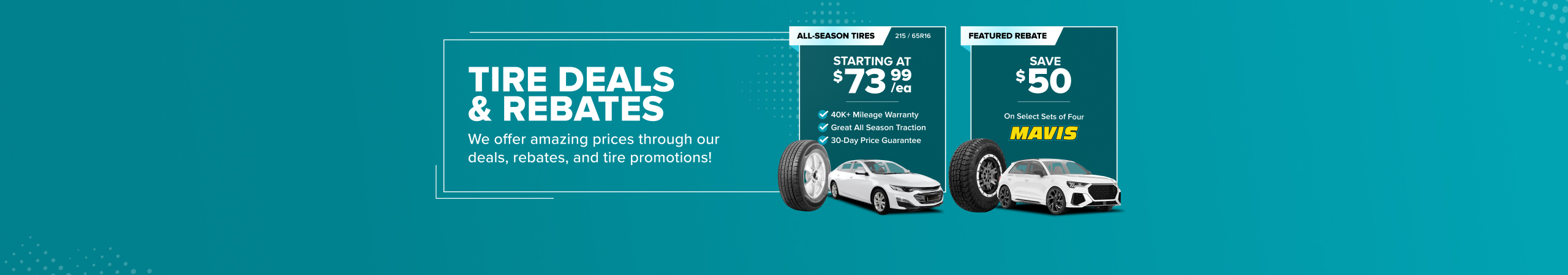 On the rare occasion that you find tires sales at a lower price, just submit the ad, tire size, and brand to our Price Buster Squad. You'll be shown available tire deals at the same price. Take advantage of our exclusive tire sales and get the best deals on high-quality tires for your vehicle. Save more with our unbeatable tire sales today!